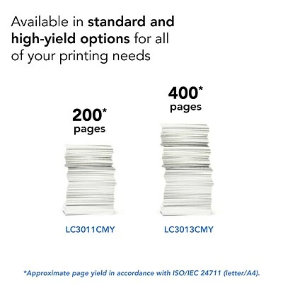 Brother Genuine LC3013C High-yield Cyan Ink Cartridges deliver consistent print quality with a 400-page yield* and work seamlessly with your Brother inkjet printer to produce rich, vivid color prints that last over time. For environmentally responsible cartridge disposal information visit www.brother-usa.com/environment. Use Brother Genuine LC3013C with Brother Work Smart Series all-in-one printers: MFC-J491DW, MFC-J497DW, MFC-J690DW, MFC-J895DW.
