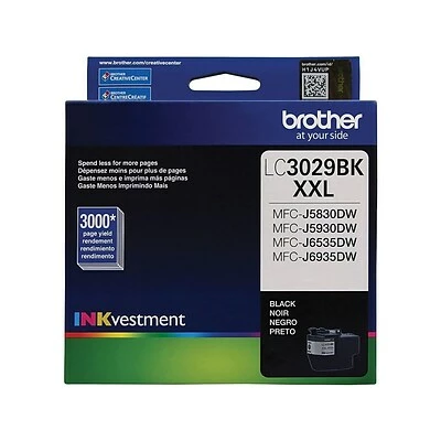 Enjoy a high-quality printing experience with this super-high-yield black ink cartridge. With a yield of up to 3,000 pages*, this cartridge is a strong choice for busy offices and other businesses with frequent printing tasks. This Brother INKvestment LC3029BK ink cartridge has vivid black ink to give text and images bold contrast against white paper, and it’s sold individually, so you can purchase the exact quantity needed.