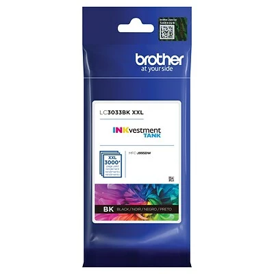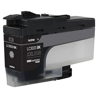 Brother Genuine LC3033BK Single Pack Super High-yield Black INKvestment Tank Cartridges deliver convenience and consistent print quality with up to 3,000-page yield.* For environmentally responsible cartridge disposal information visit www.brother-usa.com/environment. Use Brother Genuine LC3033BK with Brother INKvestment Tank inkjet all-in-one printers MFC-J995DW and MFC-J995DW XL that feature Brother tank technology.