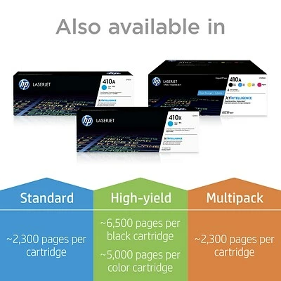 With consistent prints that give you professional results on every page, Original HP 410A black toner cartridges (CF410A) provide the clean black text and nuanced graphics you need for every presentation and project. Original HP toner is reliable so you can maintain productivity while keeping costs down.
