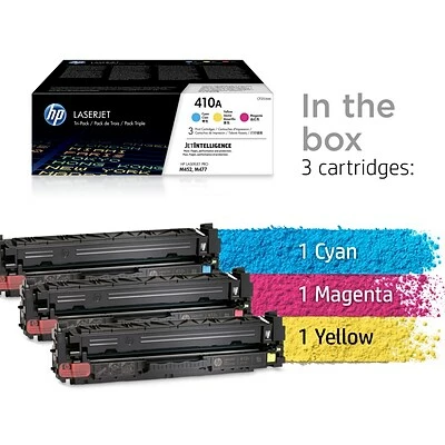 What’s in the Box: 1 New Original HP 410A pack of 3 toner cartridges (CF253XM): 1 Cyan (CF411A), 1 Yellow (CF412A) & 1 Magenta (CF413A)