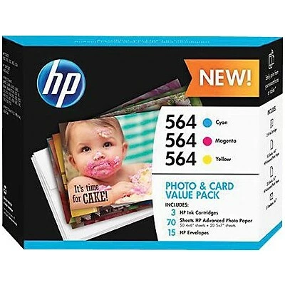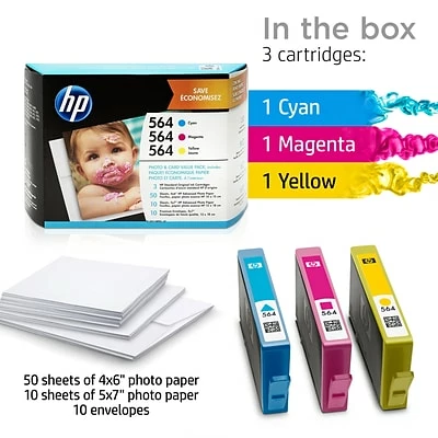 Get the convenience of HP photo paper and Original HP cyan, magenta, and yellow ink cartridges (J2X80AN) in one package so you can be confident that every print comes out perfect. Enjoy consistently crisp text, clean edges, and dynamic graphics with Original HP 564 ink cartridges combo pack.