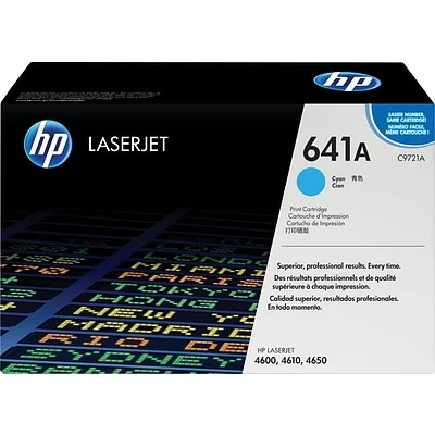 Get premium print results with this cyan toner cartridge. The duty cycle of up to 8,000 pages lets you take on many printing projects before having to replace this cartridge, making this toner ideal for large offices. This HP 641A toner cartridge installs easily into select HP Color LaserJet printers for convenience, and the cyan toner delivers rich, vibrant color.
