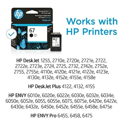 HP 67 ink cartridges work with: HP ENVY 6052, 6055, 6058, 6075, HP ENVY Pro 6452, 6455, 6458. HP DeskJet 1255, 2732, 2752, 2755, DeskJet Plus 4140, 4152, 4155, 4158