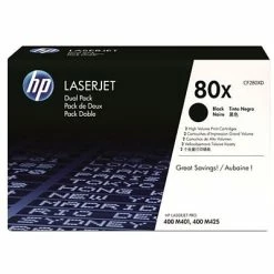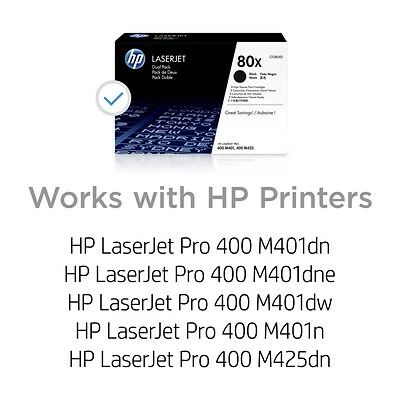 Original HP LaserJet high-capacity dual packs offer a better value than individual cartridges. Produce more pages for a lower price with two high-capacity cartridges packaged together. Save on shipping and handling with only one product to order. Decrease downtime by keeping an extra cartridge on hand. Make a professional impression with crisp black-and-white documents. Count on consistent results—page after page and cartridge after cartridge. This HP LaserJet Pro M401n and 400 toner is compatible with several HP LaserJet Pro printers.