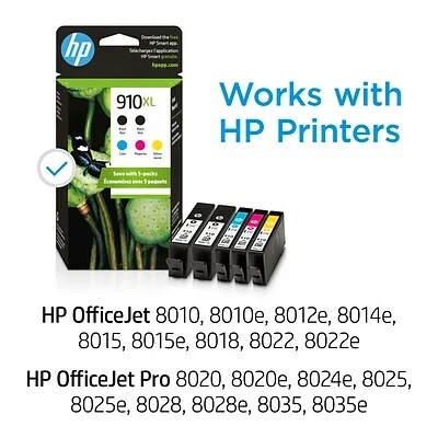 HP 910XL Black/Cyan/Magenta/Yellow High Yield Ink Cartridges, 5/Pack (6ZA558AN) is compatible with the following HP printers: