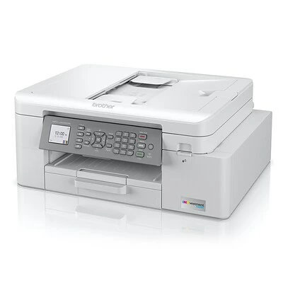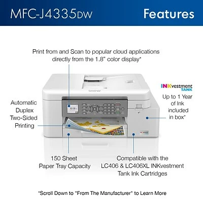 The Brother INKvestment Tank MFC-J4335DW color inkjet all-in-one wireless printer with automatic duplex printing and up to one year of ink in-box keeps pace with the growing use of color printing at home, at school, and in the office. Delivering high-quality color and black-and-white prints, the enhanced color graphics and re-engineered ink provide vivid colors making it great for printing photos and color documents. The MFC-J4335DW offers fast print and scan speeds and full print, copy, scan, and fax functionality along with the ability to wirelessly print, copy, and scan. The MFC-J4335DW uses INKvestment Tank ink cartridges that hold more ink than traditional cartridges and work with the printer’s internal ink tank. Versatile paper handling includes an up to 20-sheet automatic document feeder, bypass tray, and 150-sheet capacity paper tray. The 1.8″ color display enables you to easily navigate to powerful features plus print from and scan to popular cloud services including Google Drive, Dropbox, Box, OneDrive, and more, directly from the printer.