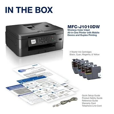 The affordable Brother MFC-J1010DW is an ideal color inkjet all-in-one printer for your home, home office or small office. It includes robust features and business-centric functionality not normally found in similarly priced inkjet printers plus print speeds up to 17 ppm for black and white and 9.5 ppm for color. The MFC-J1010DW is easy to connect and operate along with being compact and economical, perfect for small spaces and budgets. This wireless printer has multiple flexible connection options, including a built-in wireless interface for sharing with multiple users on your network, Wi-Fi Direct® or connect locally to a single computer via a USB interface. Delivering high quality, reliable printing, copying, scanning and faxing and enabling wireless printing from your desktop, laptop, smartphone or tablet. Use the 1.8” color display to easily navigate on screen menus. This printer features the Brother Mobile Connect App, a user-friendly interface that gives you the freedom to print and manage your printer from virtually anywhere. The MFC-J1010DW also features the unique Brother Page Gauge which estimates remaining page levels, so you always know how much ink you have left. Use the 20-page capacity automatic document feeder or the 150-sheet capacity adjustable paper tray for generous output without constant monitoring. Two-sided printing helps save paper, while mobile device printing and Cloud connectivity let you print-from and scan-to popular Cloud services directly from the device. Comes with a 1-year limited warranty and free online, live chat or phone support for the life of the printer.
