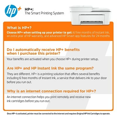 HP+ SMART PRINTING SYSTEM – The optional HP+ system enables your printer to think ahead so it’s more secure, more productive and ready when you are. Requires an HP account, internet connection and use of only Original HP Ink for the life of the printer.