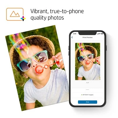 VIBRANT PHOTOS – Photos that look as vibrant as they do on your screen with true-to-phone quality prints, plus custom photo features in the HP Smart app. HP 5×5″ square and 4×12″ panoramic photo paper sizes are optimized for the HP ENVY Inspire series.
